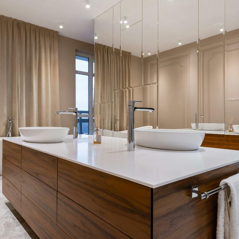minimalistic-interior-of-modern-bathroom-with-white-sink-and-bath-and-mirrore...